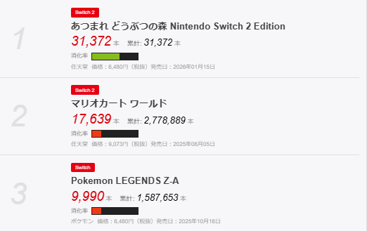 出典:ゲームソフト販売本数ランキング 集計期間:2026年01月12日~2026年01月18日