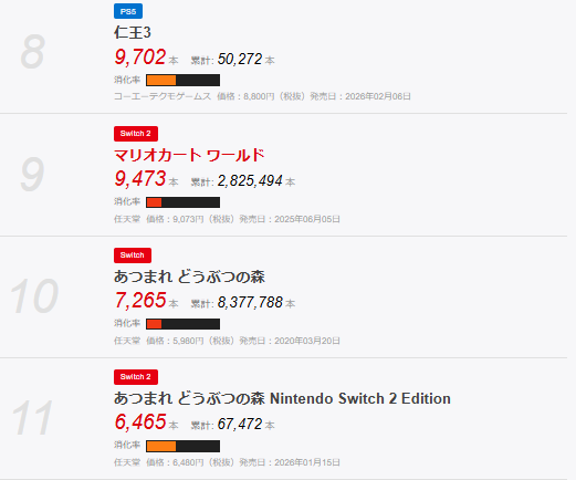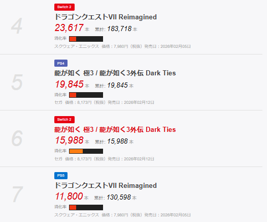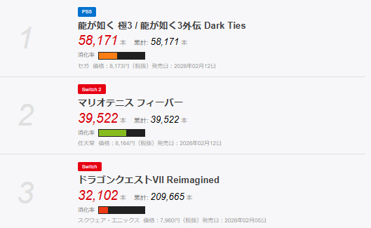 出典:ゲームソフト販売本数ランキング 集計期間:2026年02月09日~2026年02月15日