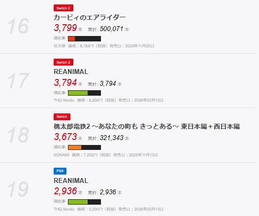 11位以下の新作は、まずマルチでREANIMALのスイッチ2版とPS5版がそれぞれ17位と19位に入っている。