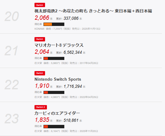 特筆すべき点はほぼないが、マリオギャラクシーがまたランキングに戻ってきており、映画効果が出始めてきているのかなとも思う。