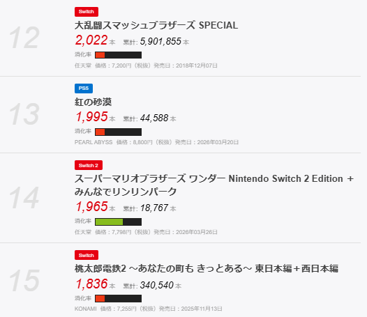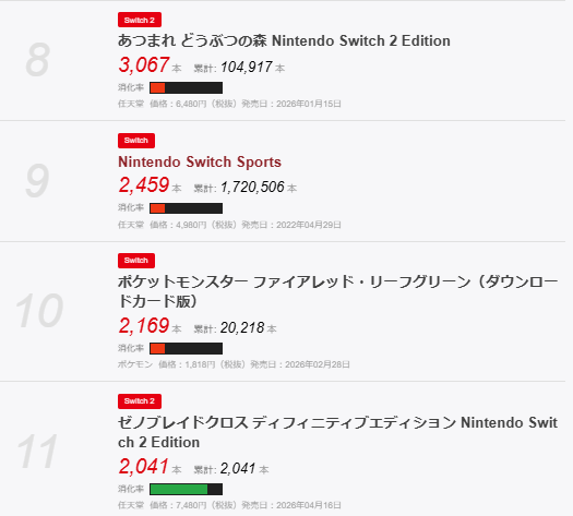 11位以下であるが、新作のランクインは11位にゼノクロDEのスイッチ2エディションのパッケージが出ている。