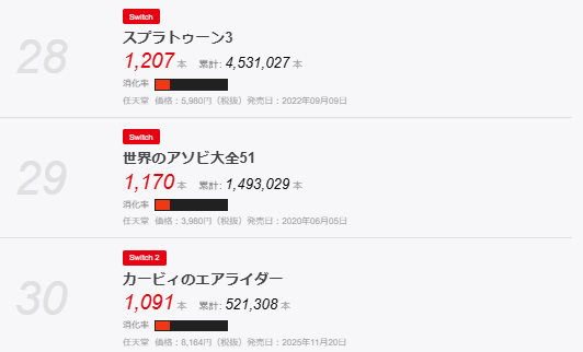 消化率と、30位までで3桁売上になってしまうソフトがあるかどうかが先週の見どころ?の一つだと思う。