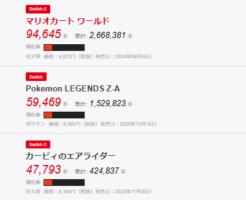 【ソフトランキング】ニンテンドースイッチ2の30週目ソフトランキングTOP30 2026年1月9日 ゲーム週販ランキング 本日ファミ通で更新された、2025年12月22日~2025年12月28日のソフトランキングTOP30の結果と、総評の記事となる。ハード販売台数・TOP10総括は昨日の記事参照。 続きを読む Comment(0)