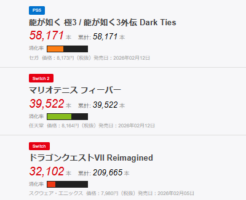 本日ファミ通で更新された、2026年02月02日~2026年02月08日のソフトランキングTOP30の結果と、総評の記事となる。ハード販売台数・TOP10総括は昨日の記事参照。